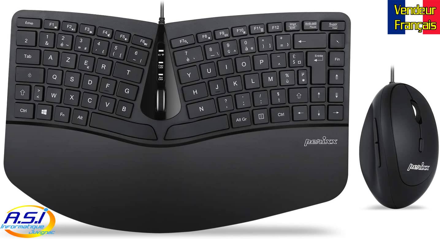 Clavier Ergonomique AZERTY Perixx pour un confort et une efficacité accrue grâce à ses 2 pavé de touche droit et gauche séparé en 2 blocs courbés pour limiter les tensions sur les bras, les mains et les poignets afin d’éviter la tendinite de l’informaticien (tennis elbow), le syndrome du canal carpiens et pour les personnes atteintes de TMS. Bien entendu un petit laps de temps est nécessaire pour s’adapter à ce type de clavier filaire (USB).